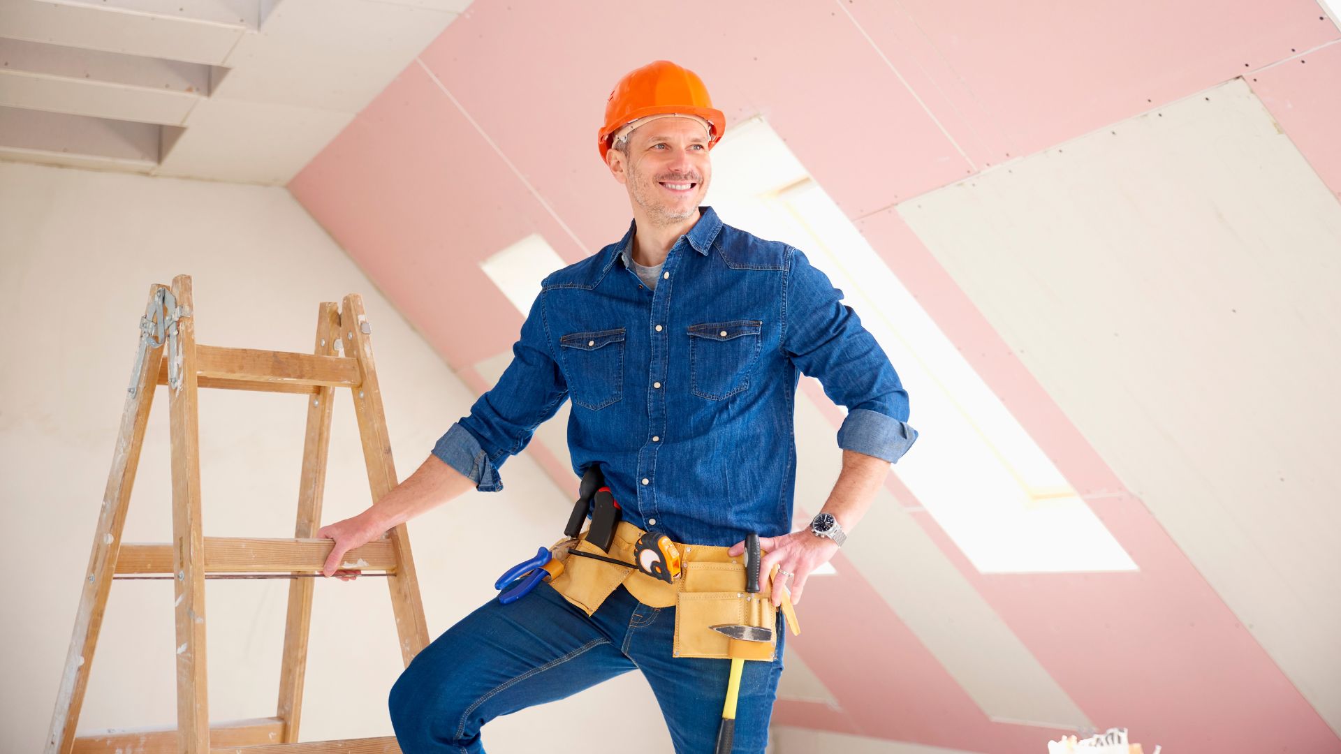 Illustration of a smiling handyman wearing a cap, overalls, and a tool belt, standing and gesturing with one hand.